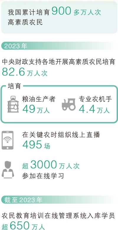 目前,我國累計培育900多萬人次高素質農民。嘗鮮新技術、涉足新業(yè)態(tài),一批批高素質農民積極擁抱專業(yè)化、規(guī)模化、標準化的現代經營理念,為農業(yè)農村發(fā)展保持穩(wěn)中向好態(tài)勢提供了有力支撐。
