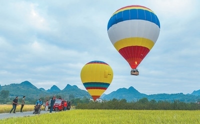 10月6日,湖南寧遠(yuǎn)縣灣井鎮(zhèn)十里畫廊,游客乘坐熱氣球觀賞田園美景。蔣克青攝(人民視覺)