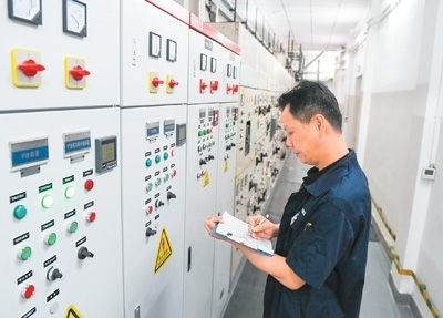 8月21日,在廣東省深圳市國(guó)貿(mào)大廈空調(diào)機(jī)房,物業(yè)工作人員在新裝的智能物聯(lián)網(wǎng)控制柜前進(jìn)行運(yùn)行抄表。新華社記者 毛思倩攝