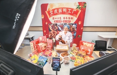 在浙江省嘉興市南湖區(qū)湘家蕩農(nóng)業(yè)加工園,老字號企業(yè)嘉興文虎醬鴨股份有限公司的直播間內(nèi),工作人員在直播銷售醬鴨。
