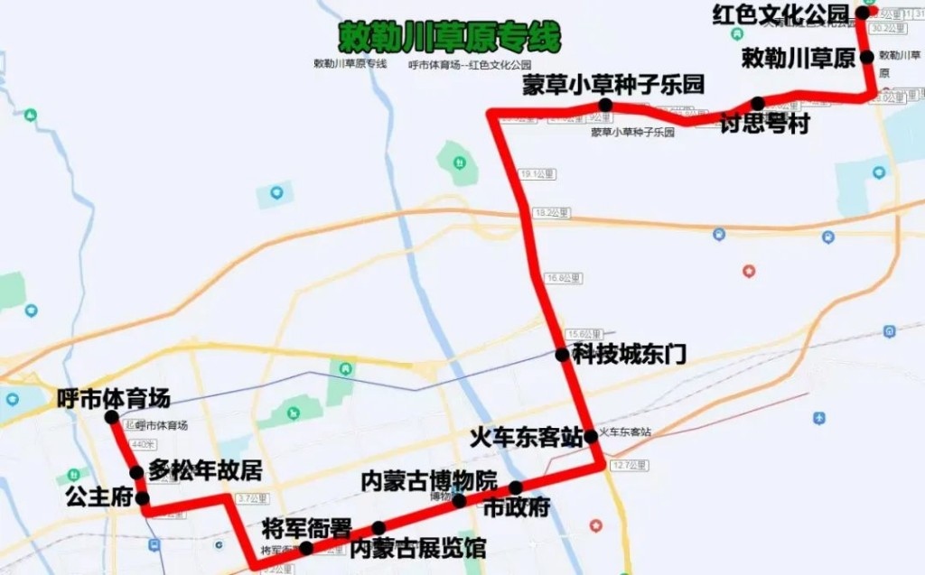 敕勒川草原專(zhuān)線(xiàn)(呼市體育場(chǎng)——紅色文化公園)途經(jīng):氣象局西巷、海拉爾西街、呼倫南路、新華大街、新華東街、科爾沁北路輔道、呼和塔拉西街、呼和塔拉東街、野馬圖、Y371。沿途設(shè)站:呼市體育場(chǎng)、多松年故居、公主府、將軍衙署、內(nèi)蒙古展覽館、內(nèi)蒙古博物院、市政府、火車(chē)東客站、科技城東門(mén)、蒙草小草種子樂(lè)園、討思號(hào)村、敕勒川草原、紅色文化公園,單程:30.5公里,配車(chē):8—10臺(tái)。