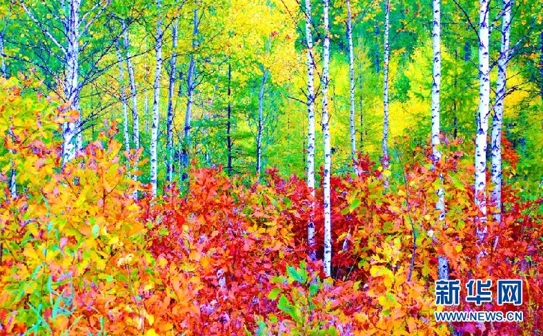 松樹林、白樺林、柞樹林和一片片混交林“染”成不同色彩,茫茫林海宛若一幅匠心獨運的繽紛畫卷。(9月28日攝)新華網發(fā)(欒維敬 攝)