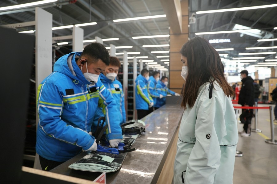 滑雪愛好者正在領(lǐng)取雪具