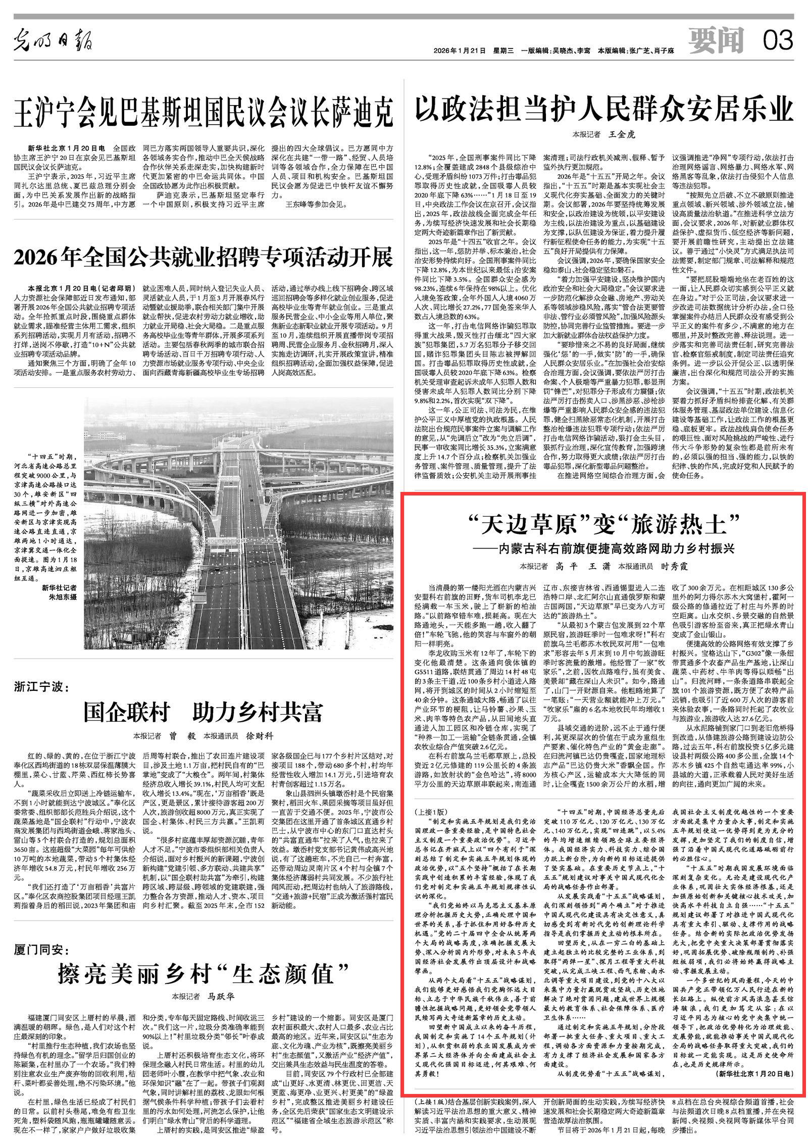 2026年1月21日《光明日報》第3版刊發(fā)了《“天邊草原”變“旅游熱土”——內(nèi)蒙古科右前旗便捷高效路網(wǎng)助力鄉(xiāng)村振興》的文章,報道了過去五年,科右前旗投資5億多元建設(shè)縣村兩級公路400多公里,全旗14個蘇木鄉(xiāng)鎮(zhèn)425個自然屯通達率99%,小縣城的大道,正承載著人民對美好生活的向往,通向更加廣闊的未來。