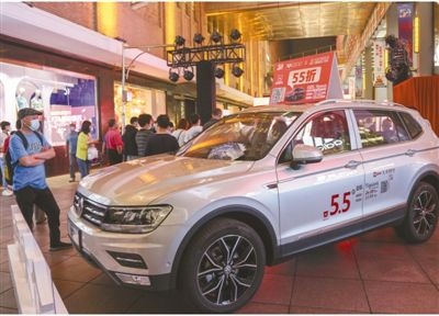 近日,上海南京路步行街上,不少商家采取“線上線下”聯(lián)動(dòng)方式推出各類汽車促銷活動(dòng)。圖為促銷活動(dòng)現(xiàn)場(chǎng)。人民視覺(jué)