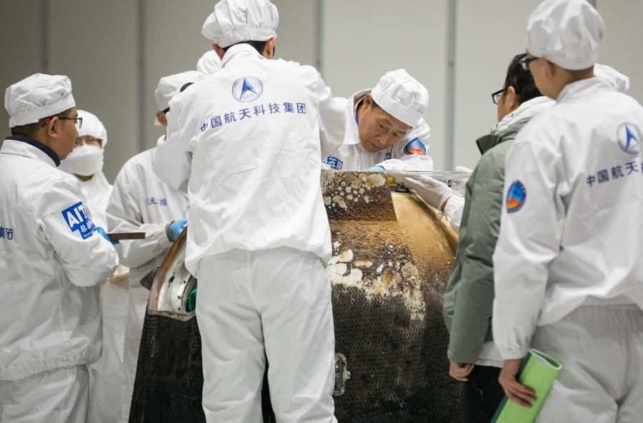 2020年12月17日,在中國航天科技集團(tuán)五院,科研人員打開嫦娥五號(hào)返回器艙門,取出裝有月球樣品的容器并進(jìn)行稱重。新華社記者金立旺攝