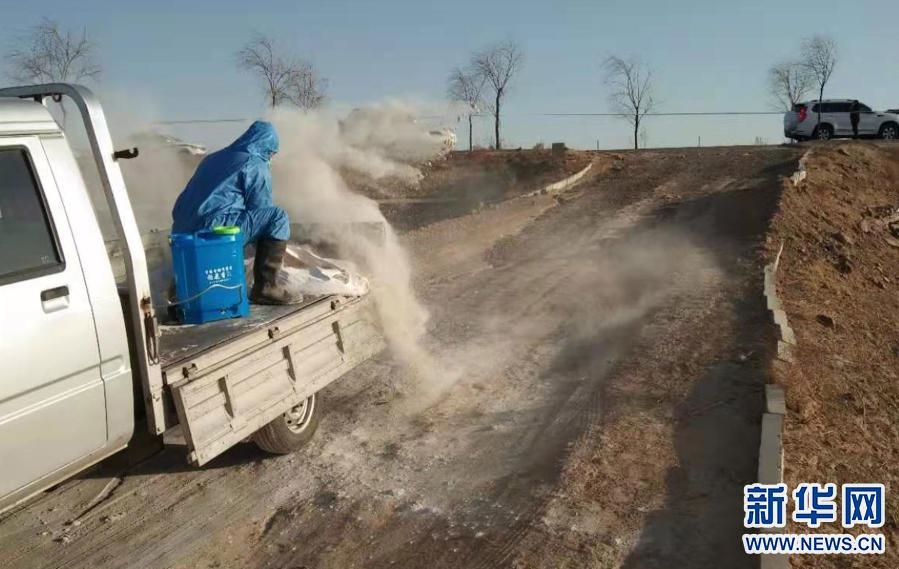 3月21日,達拉特旗疫控人員對黃河國堤內(nèi)死豬丟棄區(qū)域進行消毒。新華社發(fā)