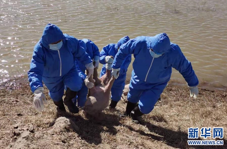 3月21日,當?shù)卣块T派出的工作人員在達拉特旗黃河國堤內(nèi)收集死畜。新華社發(fā)