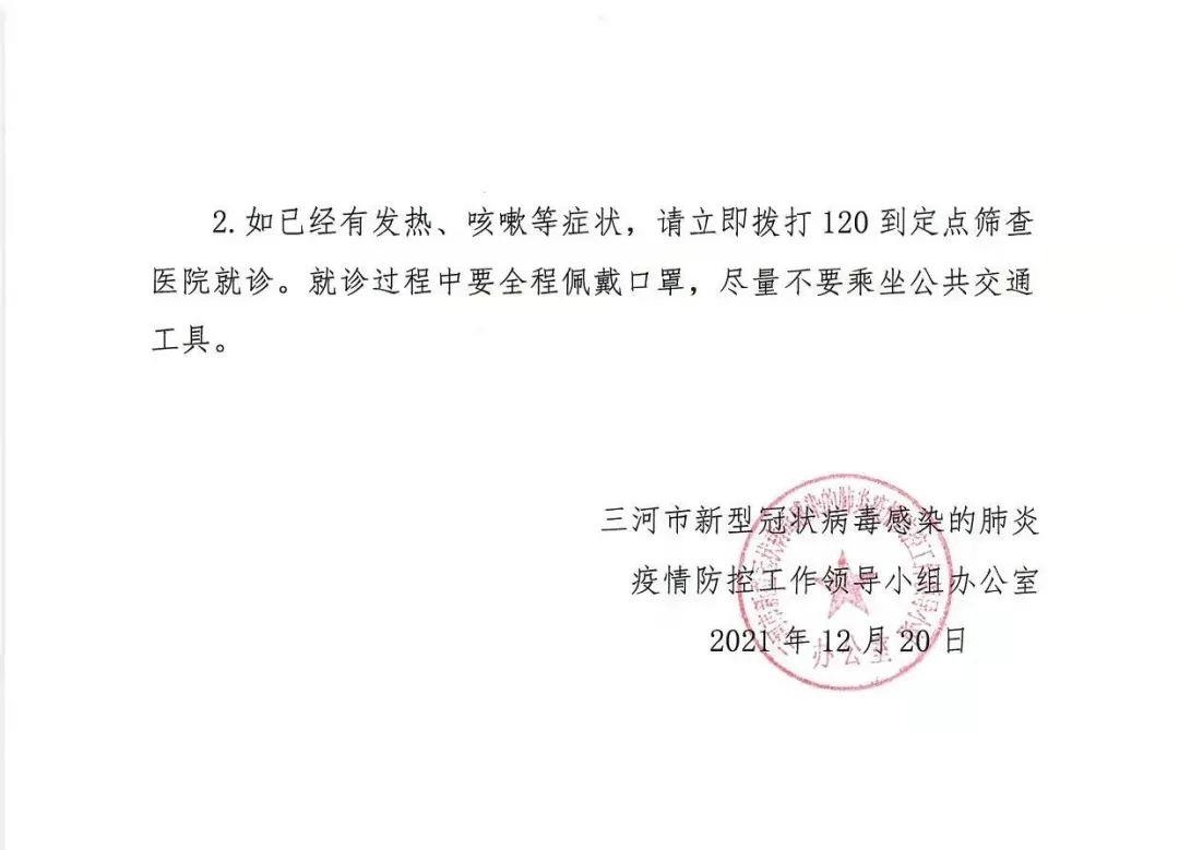 中新網(wǎng)12月20日電 據(jù)河北三河市網(wǎng)信辦官方微信消息,三河市新冠肺炎疫情防控工作領(lǐng)導(dǎo)小組辦公室今日發(fā)布公告,通報(bào)1例北京確診病例密接者行動(dòng)軌跡。