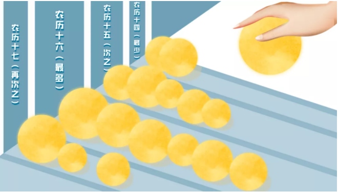 統(tǒng)計發(fā)現(xiàn),“滿月”出現(xiàn)次數(shù)最多的是農(nóng)歷十六,其次是農(nóng)歷十五,再次是農(nóng)歷十七,最少的是農(nóng)歷十四。