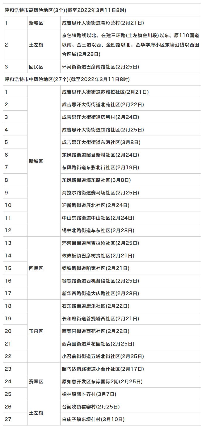 按照國(guó)務(wù)院聯(lián)防聯(lián)控機(jī)制《關(guān)于調(diào)整新冠肺炎疫情分區(qū)分級(jí)標(biāo)準(zhǔn)實(shí)施精準(zhǔn)管控措施的通知》規(guī)定,經(jīng)專家組評(píng)估,市指揮部研究決定,決定于3月11日8時(shí)起,將新城區(qū)保和少鎮(zhèn)野馬圖村,回民區(qū)環(huán)河街街道太平街社區(qū),玉泉區(qū)長(zhǎng)和廊街道大召社區(qū)、小召前街街道建華北街社區(qū)調(diào)整為低風(fēng)險(xiǎn)地區(qū)。其他地區(qū)風(fēng)險(xiǎn)等級(jí)不變。