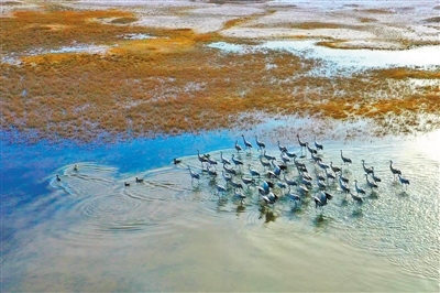 3月的鄂托克草原春光明媚、萬物復(fù)蘇。黃河一級支流——都思圖河兩岸,風(fēng)吹草偃間,珍禽掠影過,灰鶴、赤麻鴨、天鵝、豆雁等各種鳥類在河中嬉戲打鬧,一幅人與自然和諧共生的美麗生態(tài)畫卷徐徐呈現(xiàn)。