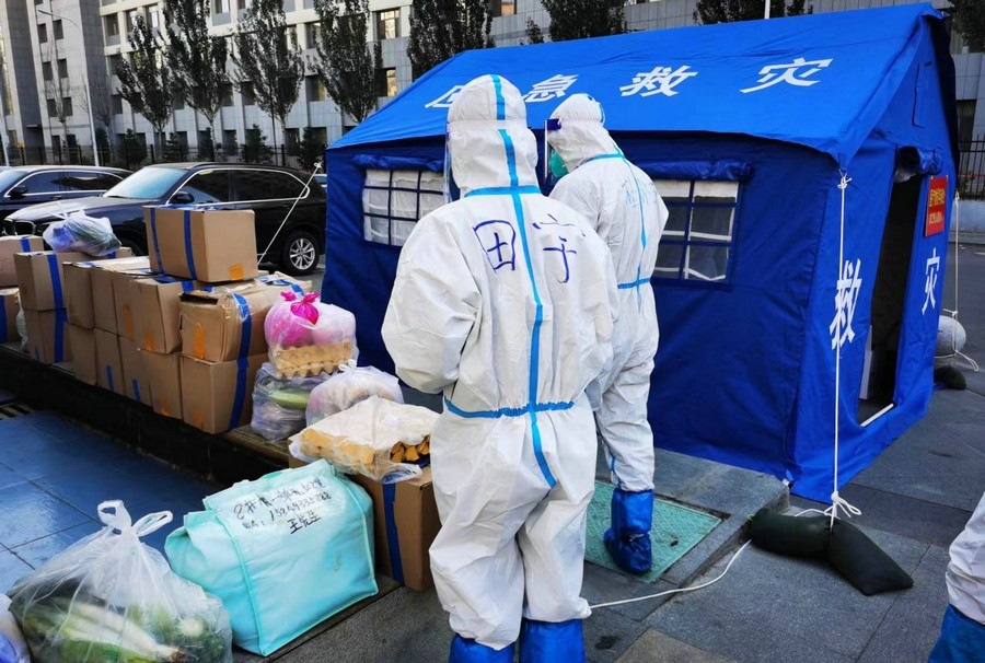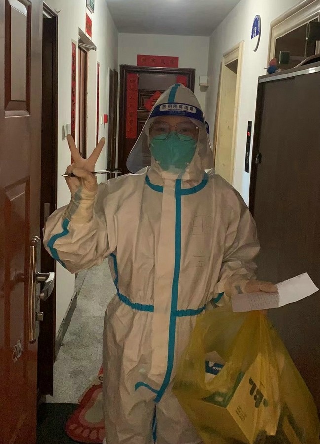 即使單元出現陽性病例,田宇依舊穿著防護服,佩戴好口罩,第一時間將物資運送到位。有時物資集中配送,田宇需要往返多次搬運大量的物資。有時鄰居填錯地址,還需要到別的居民樓幫忙找尋。但她從未有過一句怨言,面對鄰居們的感謝和贊揚,她總是憨厚地和大家說“不要客氣”。當鄰居們因為小區(qū)的封控管理或物資短缺產生焦慮或不滿時,她也會在第一時間解釋說明,疏導大家的情緒。