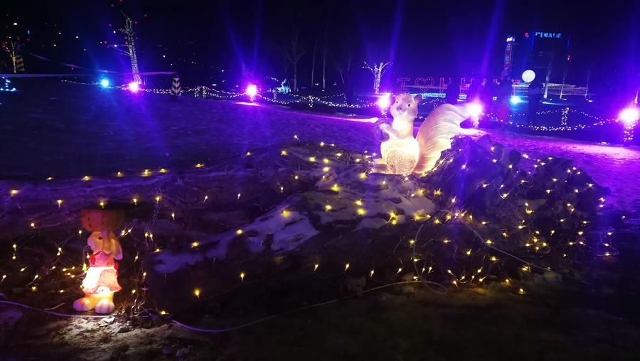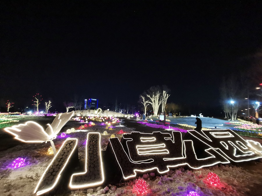 串燈、月球燈、抱樹燈、地插花、氣球燈點綴,搭配動物造型燈,整個小草公園生機勃勃?!翱茨沁呥€有雪人”,小朋友的歡呼聲打破了夜晚的寂靜。
