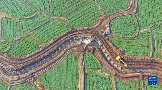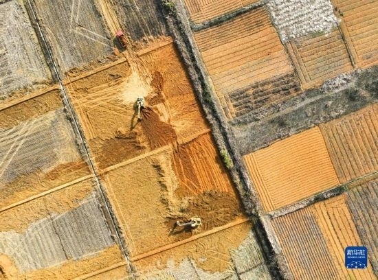 2月16日,在湖南省永州市道縣壽雁鎮(zhèn)芽洞村,工人駕駛挖掘機在高標(biāo)準(zhǔn)農(nóng)田建設(shè)項目現(xiàn)場施工(無人機照片)。