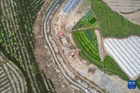 2月16日,工人在貴州省羅甸縣逢亭鎮(zhèn)腮里村治理河道,為春耕生產(chǎn)灌溉做準(zhǔn)備(無人機照片)。