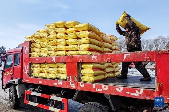 2月16日,北大荒集團五大連池農(nóng)場科技服務(wù)中心工人在裝運肥料。