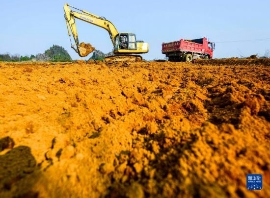 2月16日,在湖南省永州市道縣壽雁鎮(zhèn)芽洞村,工人駕駛挖掘機在高標(biāo)準(zhǔn)農(nóng)田建設(shè)項目現(xiàn)場施工。