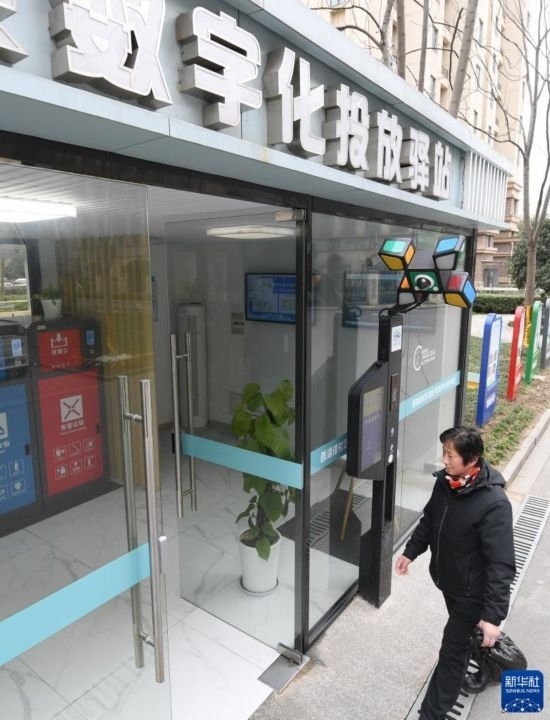 2月22日,在八里店鎮(zhèn)西湖漾社區(qū)垃圾分類數(shù)字化投放驛站,一位居民前來投放生活垃圾。