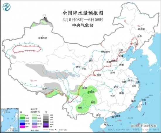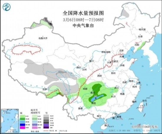 3月6日08時至7日08時,新疆北疆北部、內(nèi)蒙古東北部、西藏北部和東部、青海南部、川西高原大部等地部分地區(qū)有小到中雪或雨夾雪,其中,新疆阿勒泰等地局地有大到暴雪(10~14毫米)。云南東北部、四川中東部、重慶、湖北南部、貴州、湖南中北部等地部分地區(qū)有小到中雨,其中,湖南西部、貴州中部等地局地有大雨(25~40毫米)。內(nèi)蒙古東北部、山東半島等地部分地區(qū)有4~6級風。臺灣海峽、巴士海峽、南海大部海域?qū)⒂?~7級風。