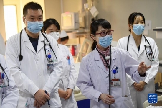 3月6日,馬娜(右二)和同事在病房?jī)?nèi)查房。