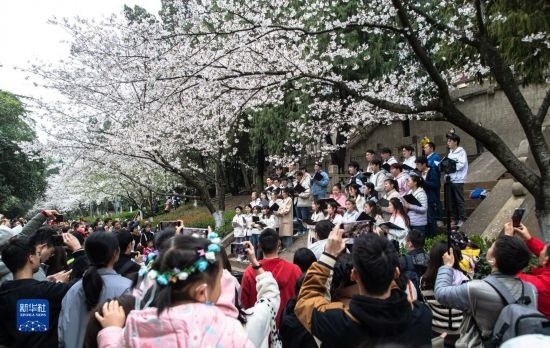 3月18日,武漢大學(xué)海燕合唱團(tuán)在賞櫻現(xiàn)場(chǎng)演唱歌曲。