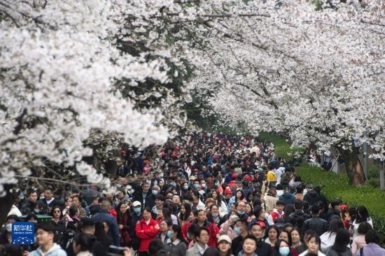 當(dāng)日,武漢大學(xué)舉行抗疫醫(yī)護(hù)賞櫻專場(chǎng)。珞珈山下,來(lái)自全國(guó)各地的1.6萬(wàn)余名抗疫醫(yī)護(hù)人員及家屬赴約賞櫻。