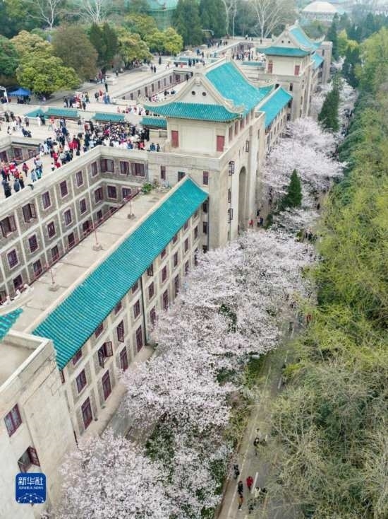 3月18日,來(lái)自各地的抗疫醫(yī)護(hù)人員及家屬在武漢大學(xué)校園賞櫻(無(wú)人機(jī)照片)。