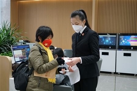 忠縣法院訴訟服務(wù)大廳導(dǎo)訴員引導(dǎo)當(dāng)事人辦理業(yè)務(wù)。
