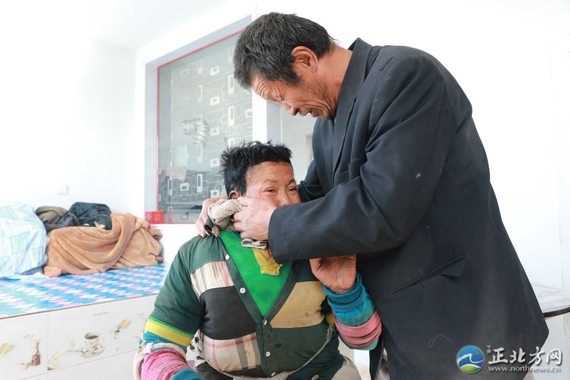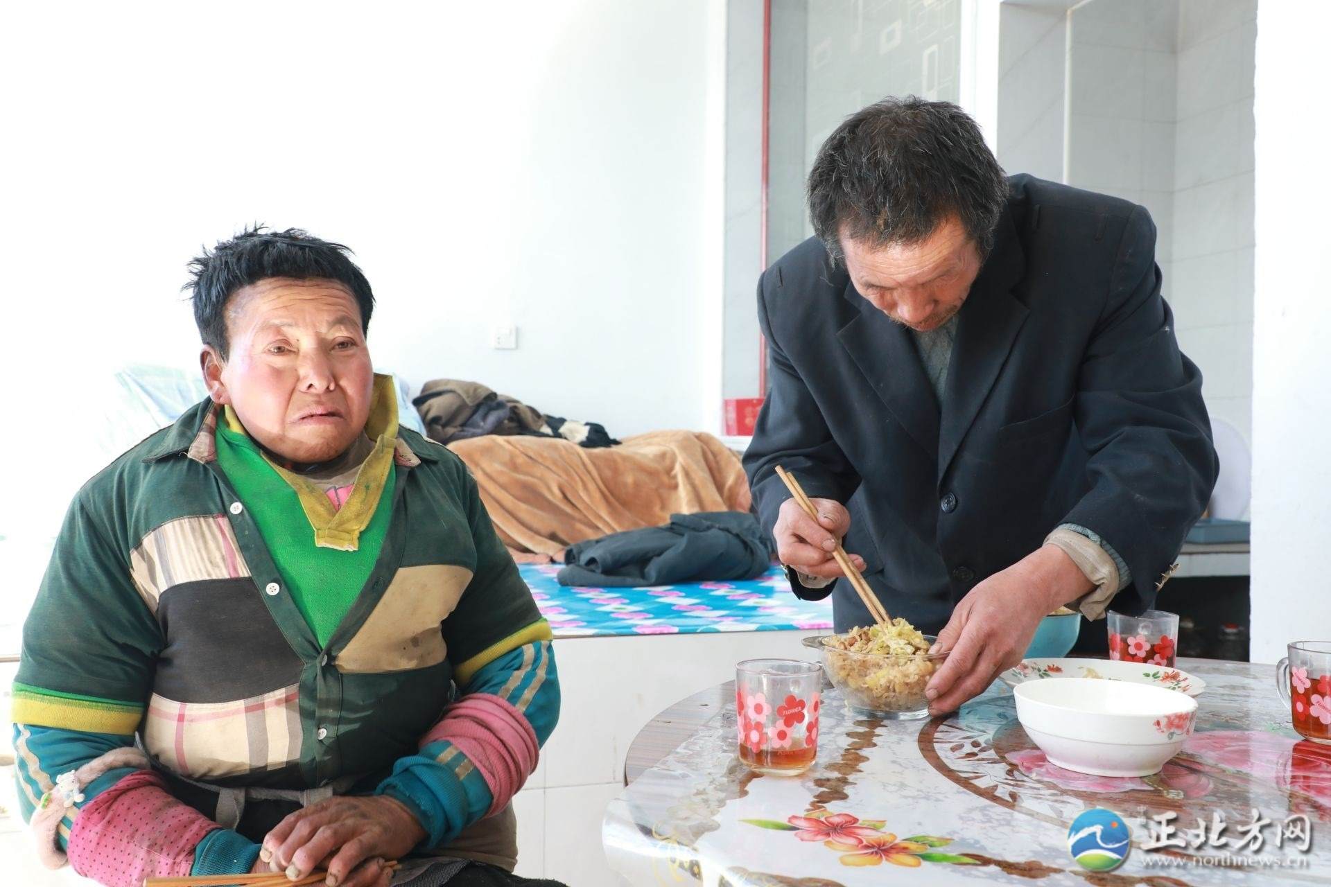 在采訪間隙,何蘭鎖的妻子王林愛回到了家,見到有陌生人顯得很局促。王林愛患有精神疾病,說話顛三倒四。何蘭鎖拿起毛巾,溫柔地為妻子擦拭沾滿灰塵的臉和手,端出早早做好的飯放在桌上:“快吃吧,有你最愛吃的咸菜?!薄傲謵燮鋵?shí)命最苦了,啥也懂不得,我要不在了,她一個(gè)人可咋辦呀。我現(xiàn)在最大的心愿是希望能讓她去接受治療?!焙翁m鎖止不住地哽咽道。