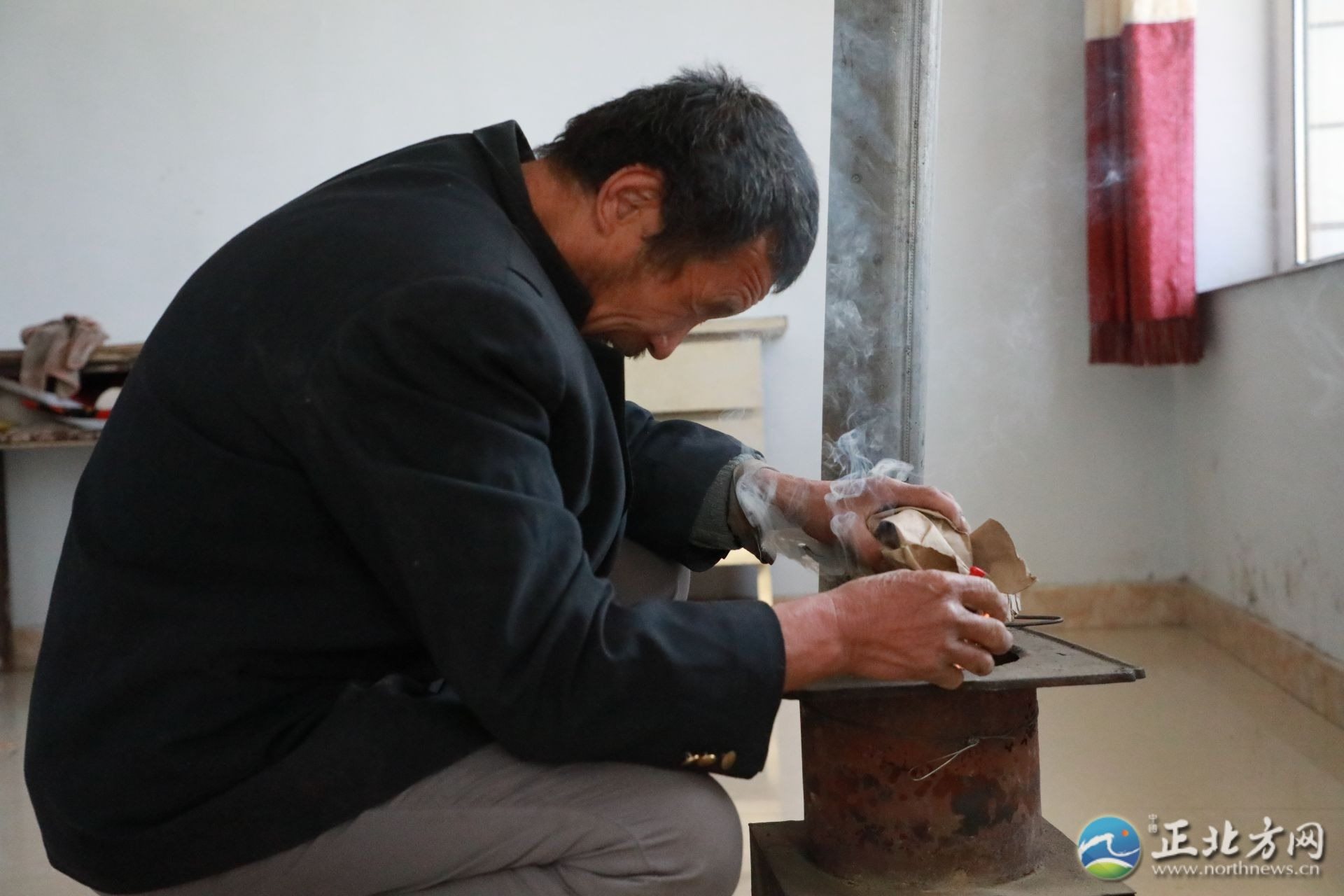 何蘭鎖63歲,黝黑的臉膛,兩個(gè)眼窩深陷,看不到眼珠。聽到記者來(lái)采訪,他熱情地把記者讓進(jìn)屋,摸索著拿起水壺倒了兩杯熱茶,“你們稍坐一坐,家里有點(diǎn)冷。”何蘭鎖笑起來(lái)眉眼彎彎,說著,又轉(zhuǎn)身拿著錘子,熟門熟路地進(jìn)入涼房去打炭,開始生火。