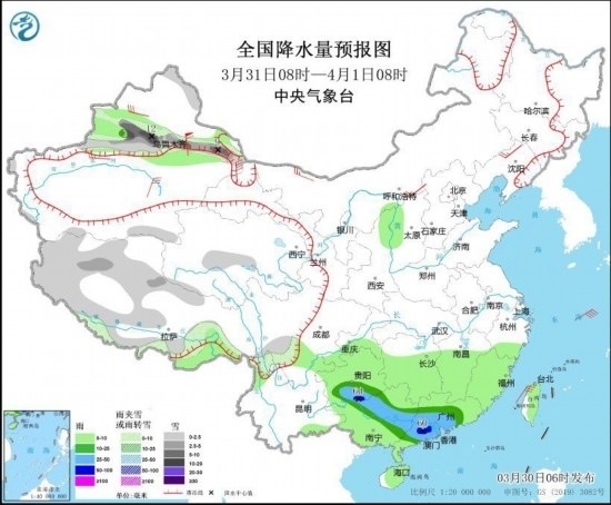 3月30日08時(shí)至31日08時(shí),新疆沿天山地區(qū)、西藏東部和南部、川西高原南部、青海東北部、甘肅東部等地部分地區(qū)有小到中雪或雨夾雪,其中,新疆沿天山等地部分地區(qū)有大雪(5~8毫米);新疆伊犁河谷、西藏東南部、西北地區(qū)東北部、四川東南部、重慶南部、貴州、云南東部、湖南南部、江西中南部、浙江、福建、廣西、廣東、海南島等地部分地區(qū)有小到中雨。新疆北部、內(nèi)蒙古中部、黑龍江東部、遼東半島等地部分地區(qū)有4~6級(jí)風(fēng)(見圖1)。東海大部海域有5~7級(jí)風(fēng),陣風(fēng)8級(jí)。