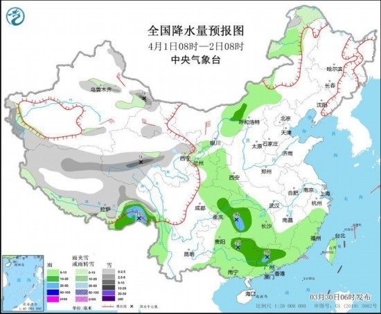圖1 全國降水量預(yù)報(bào)圖(3月30日08時(shí)-31日08時(shí))