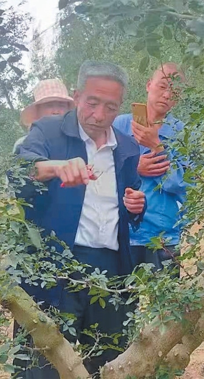 甘肅省秦安縣農(nóng)業(yè)技術(shù)推廣研究員靳志強(qiáng)(中)向農(nóng)民傳授剪枝技術(shù)。潘虎林?jǐn)z