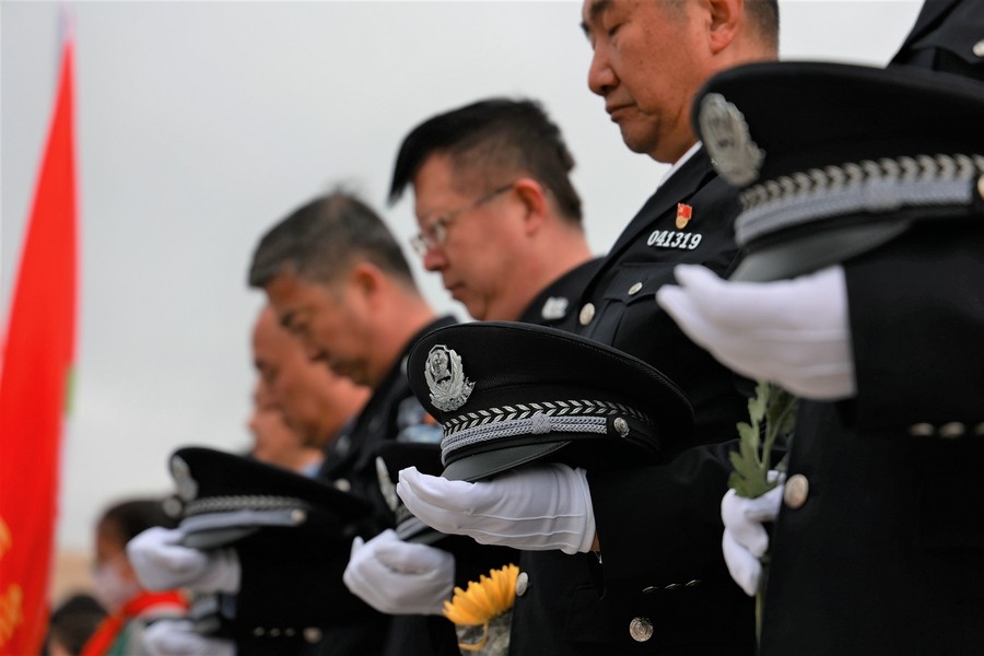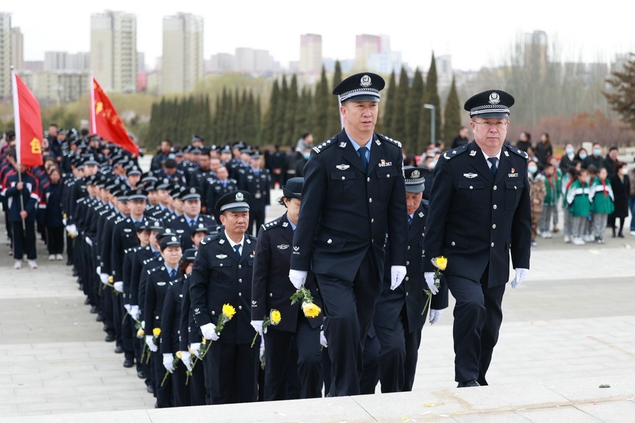 上午10時(shí),60名干部民警整齊列隊(duì),警容嚴(yán)整,脫帽肅立,向?yàn)槿嗣窆彩聵I(yè)英勇獻(xiàn)身的英烈默哀,緬懷他們的豐功偉績(jī),寄托對(duì)革命先烈的無(wú)限哀思。伴著肅穆的《獻(xiàn)花曲》,民警們依次瞻仰紀(jì)念碑并敬獻(xiàn)鮮花。隨后,全體民警面向黨旗和烈士紀(jì)念碑,高舉右拳,以錚錚誓言筑牢理想信念,以拳拳初心踐行為民宗旨。(王鵬)