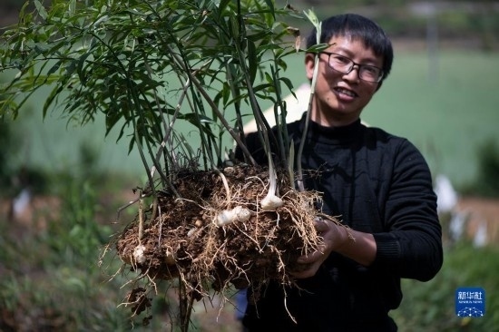 4月15日,村民在貴州省開陽縣南龍鄉(xiāng)中橋村中藥材種植基地展示采收的黃精。