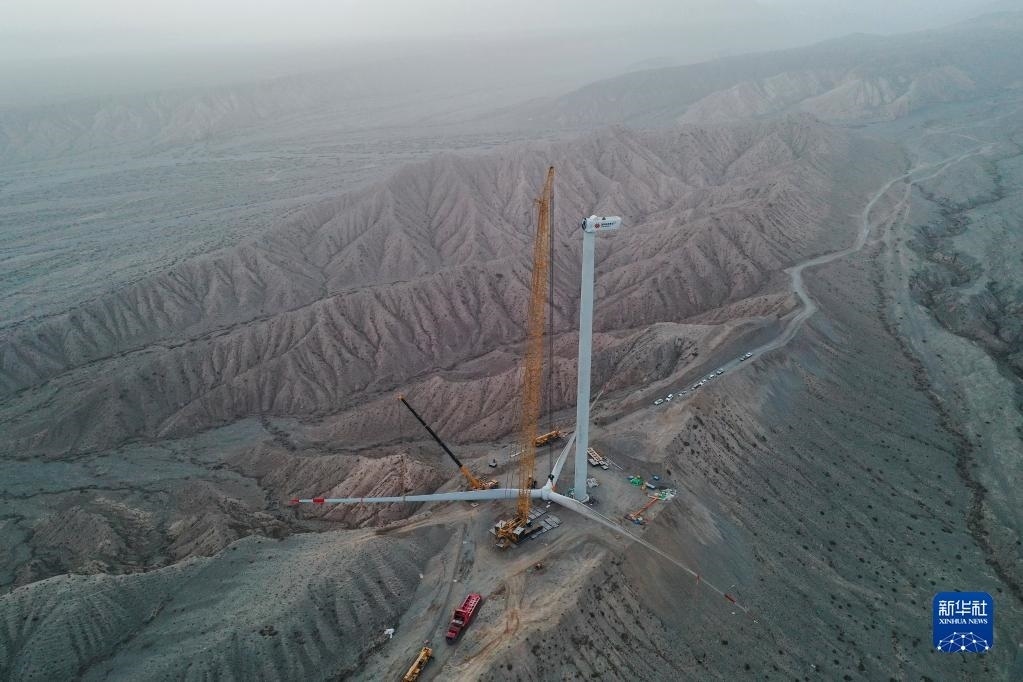 4月22日,在新疆克孜勒蘇柯爾克孜自治州烏恰縣,完成吊裝的風(fēng)機(jī)矗立在昆侖山北麓(無人機(jī)照片)。