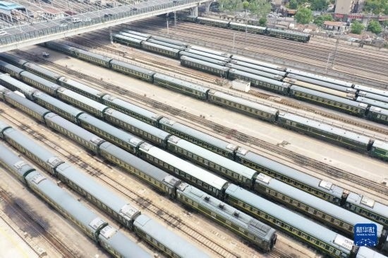 4月28日拍攝的中國鐵路上海局集團有限公司徐州站客車整備場內的臨時旅客列車(無人機照片)。