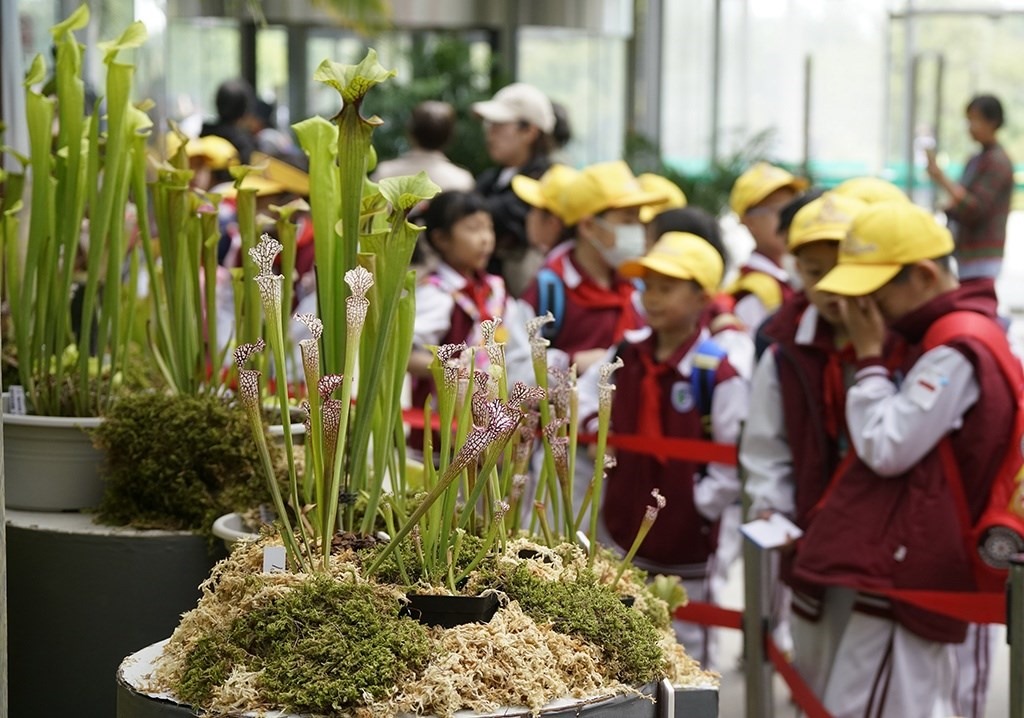 4月27日,學(xué)生們在國家植物園溫室參觀瓶子草。新華社記者 李欣 攝