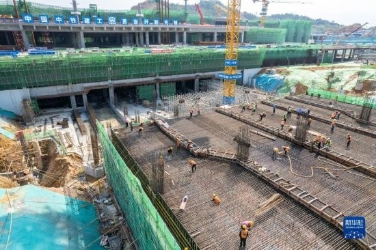 5月3日,在長(zhǎng)沙西站建設(shè)工地,工人進(jìn)行混凝土澆筑作業(yè)。