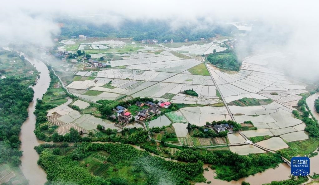 5月6日拍攝的湖南省資興市唐洞街道鏡塘村田園風光(無人機照片)。