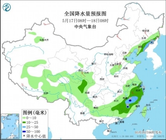 全國降水量預(yù)報圖(5月16日08時-17日08時)。圖片來源:中央氣象臺網(wǎng)站