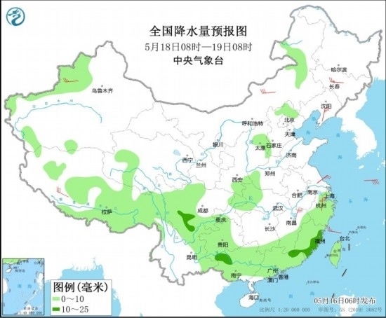 全國降水量預(yù)報圖(5月18日08時-19日08時)。圖片來源:中央氣象臺網(wǎng)站