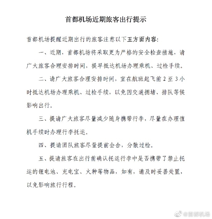 央視網(wǎng)消息:5月16日,@首都機(jī)場 官方微博發(fā)布提示:首都機(jī)場近期將采取更為嚴(yán)格的安全檢查措施,請廣大旅客合理安排時間,提早抵達(dá)機(jī)場辦理乘機(jī)、過檢手續(xù)。