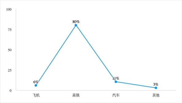 正因大部分受訪者選擇的都是周邊短途游,所以高鐵成為了最為便捷和價格適宜的交通工具,有80%的受訪者選擇的出行工具是高鐵。