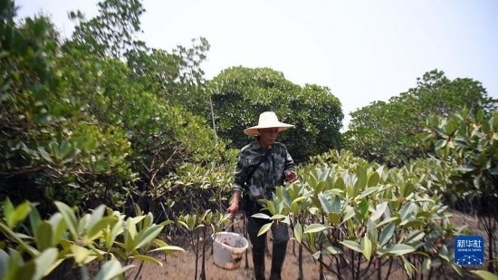 莫積瑞老人護(hù)理紅樹林小苗(5月20日攝)。