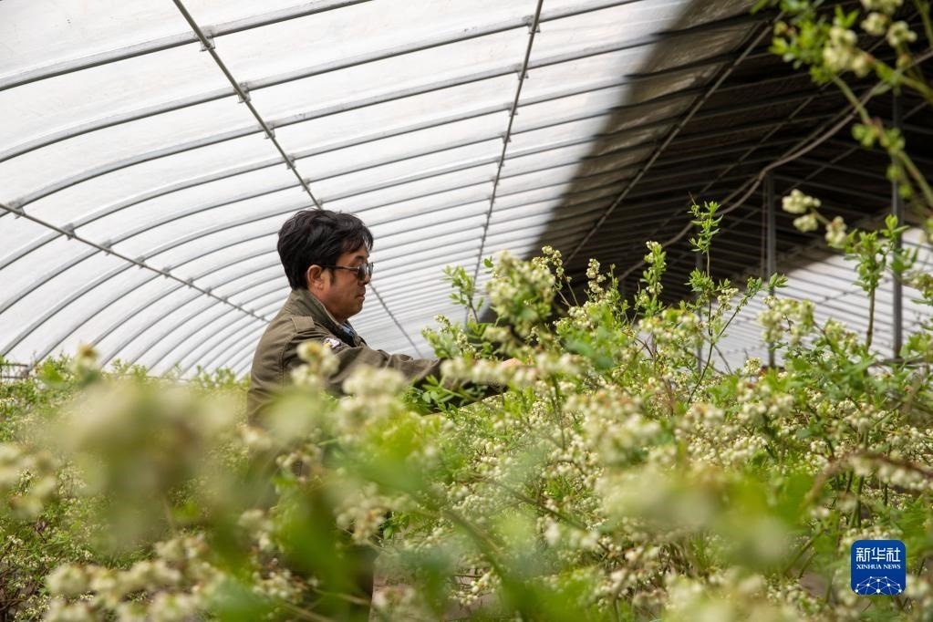 5月20日,在黑龍江伊藍生物科技有限公司藍莓藍靛果種植示范基地,工人在整理藍莓枝。