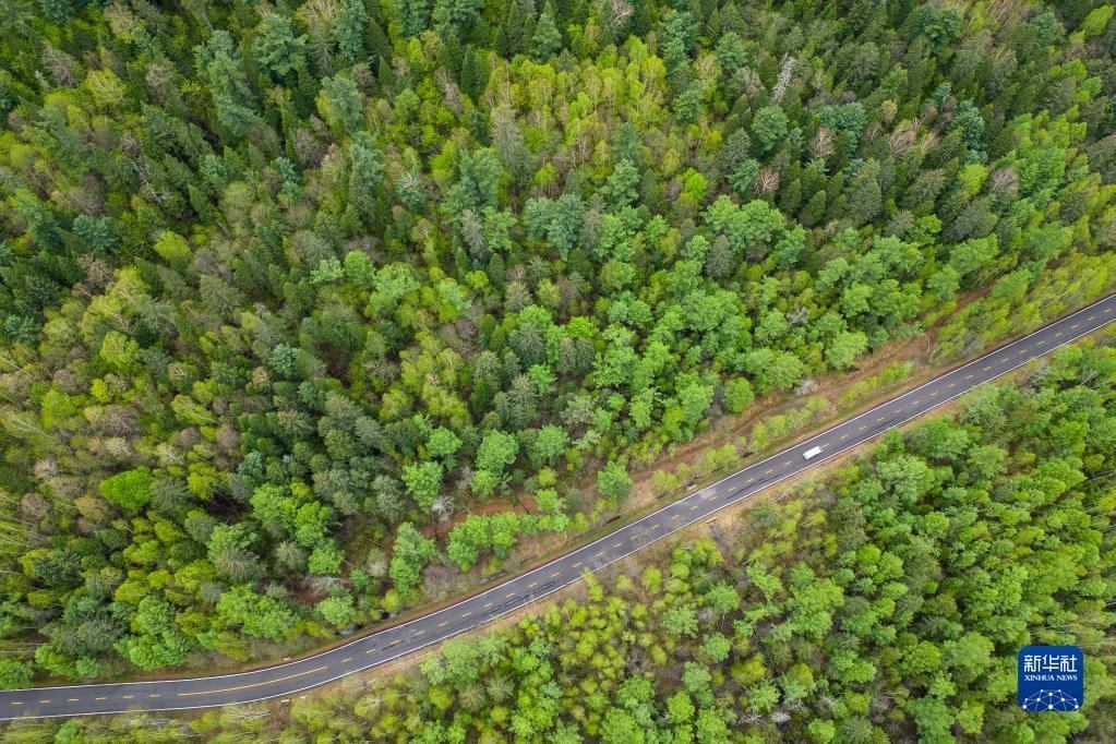 5月21日,園區(qū)車輛在五營國家森林公園內(nèi)穿行(無人機照片)。