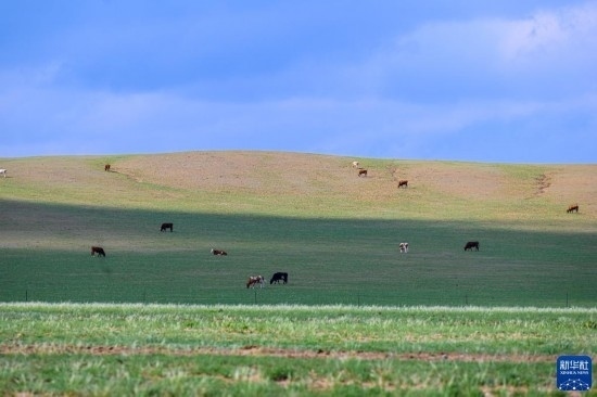 5月30日,牛群在內蒙古錫林郭勒盟蘇尼特右旗境內的草原上悠閑覓食。