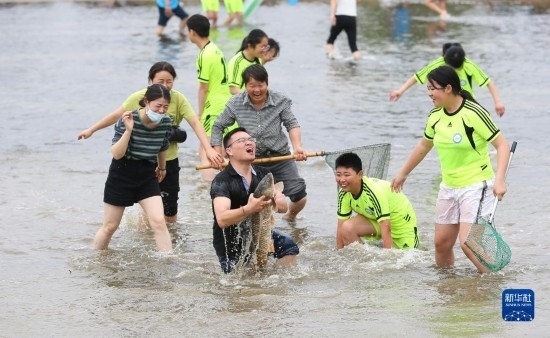 5月30日,在淮安市洪澤區(qū)岔河鎮(zhèn),人們?cè)诓逖砉?jié)上參加摸魚比賽(無(wú)人機(jī)照片)。